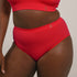 Sustainable red high waist brief by Underwear for Humanity: ethical, sustainable. sizes 6-30 light, breathable. Models wear high-waisted underwear. underwear sits high on the waist, full seat coverage. smooth under clothing. made from Tencel and recycled materials, attached no-dig recycled elastic waist band.